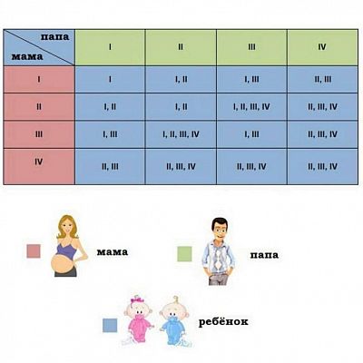 А возможный вариант группы крови ребенка, вы сможете заранее определить, сопоставив, как на втором фото, группу крови мамы и папы».