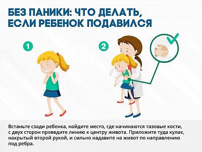 Если подавился младенец — положите его животом на свое предплечье так, чтобы его лицо было на вашей ладони. Потом аккуратно ударьте меж лопаток. После переверните на спину и надавите двумя пальцами на диафрагму.