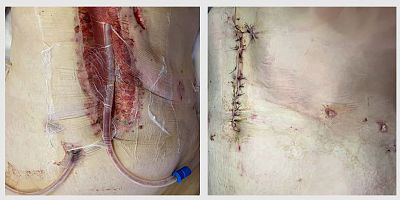 После пациентка почти неделю провела в реанимации под постоянным надзором наших опытных реаниматологов, важность действий которых невозможно переоценить. А хирурги прямо в реанимации под внутривенным наркозом регулярно меняли вакуумные повязки, под которыми стала формироваться молодая соединительная ткань, что позволило наложить швы.