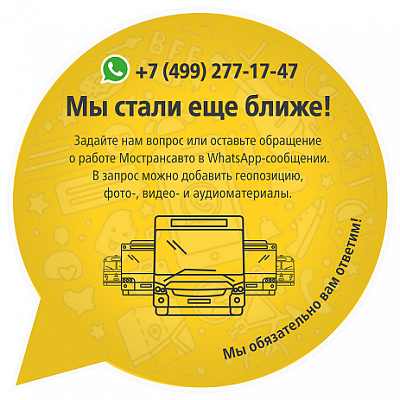 Чтобы запросить справочную информацию или оставить обращение, пассажиру необходимо направить сообщение на официальный номер предприятия +7 (499) 277-17-47. Контакт доступен в любое время, обращения принимаются круглосуточно. К текстовому сообщению можно приложить геопозицию остановочного пункта и медиафайлы: фотографии, видеозаписи, аудиоматериалы, отсканированные копии документов и др. Специалисты предприятия рассмотрят обращение и направят ответ в личные сообщения.