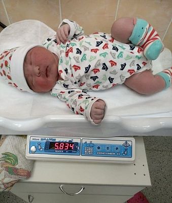 В конце декабря в нашем роддоме родился мальчик весом 5 740 гр. (5 834 гр. на фото уже в одежде) и ростом 60 см. Это был новогодний подарок не только для родителей, но и всех сотрудников роддома. В родовом боксе №2 возле роженицы в полной «боевой готовности» были акушеры-гинекологи Хаитова Рано Кенджаевна, Викулова Зоя Петровна, Галюткина Ирина Владимировна, акушерка Савушкина Светлана Владимировна и врач-неонатолог Каткова Наталья Викторовна.