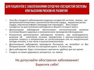 Если вы страдаете заболеванием сердечно-сосудистой системы, такими, как артериальная гипертония, ишемическая болезнь сердца, нарушения ритма сердца, перенесли инфаркт миокарда или миокардит, вам следует находиться на диспансерном наблюдении у вашего лечащего врача. Сейчас в амбулаторно-поликлинических подразделениях Московской областной больницы имени профессора Розанова В.Н. для таких пациентов организован отдельный диспансерный учет и динамическое наблюдение.