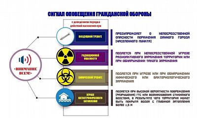 Услышав звуки сирен системы оповещения (прерывистые гудки), которые означают сигнал «ВНИМАНИЕ ВСЕМ!», нужно в самое короткое время провести необходимые защитные меры (о них подробнее ниже), немедленно включить телевизор, радиоприемник, репродуктор, репродуктор радиотрансляционной сети и слушать сообщение органов власти или управления МЧС.