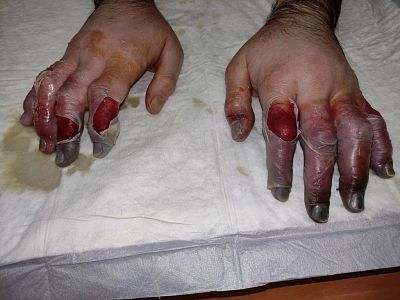 Вечером в приемное отделение Московской областной больницы имени профессора Розанова В.Н. был доставлен молодой человек 30 лет с жалобами на интенсивные боли, отечность обеих кистей, возникновение волдырей и багрово-синий цвет пальцев рук. У пациента диагностировано обморожение кистей рук II-III-IV степени.