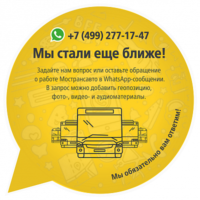 Все обращения и пожелания принимаются круглосуточно по номеру +7 (499) 277-17-47, каждое сообщение рассматривается в индивидуальном порядке. К текстовому обращению можно приложить геопозицию остановочного пункта и медиафайлы: фотографии, видеозаписи, аудиоматериалы, отсканированные копии документов и др. Чаще всего через WhatsApp жители и гости региона обращаются за справочной информацией.