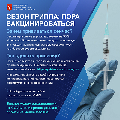 Вакцинация от гриппа и пневмококковой инфекции - сразу две прививки вы можете сделать в амбулаторно-поликлинических подразделениях Московской областной больницы имени профессора Розанова В.Н., а также в гипермаркете «Глобус» (каждый вторник и четверг с 15.00 до 21.00) и МФЦ (каждая среда с 15.00 до 20.00).
