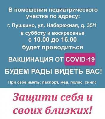 Стационарные пункты вакцинации работают по предварительной записи в поликлиниках №1 (г. Пушкино), №2 (мкр. Мамонтовка), №3 (п. Лесной), №4 (мкр. Клязьма), №5 (п. Правдинский), №6 (п. Софрино), №7 (п. Софрино-1), №8 (п. Ашукино), амбулатории №2 (мкр. Заветы Ильича).